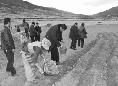 ■ 叶强平 汪培 文/图 4月13日上午,正在田间劳作的理塘县上木拉乡格中村农妇斯朗卓玛做梦也没想到,县委书记雷建平等一行人不请自来当帮工,和她一起种土豆。 在格中村的田间地头,到处是一片忙碌的春播景象。雷建平走进斯朗卓玛的田间,在农业技术人员的指导下,从选种开始学起,病害的种丢掉、大的切成几瓣,撒点底肥,均匀丢种,把盖种的土弄成一个梯形的垄。雷建平一边劳动,一边和斯朗卓玛攀谈,去年土豆收成怎样?有没有增加收入?今年春耕生产有哪些实际困难?雷建平又接着向她推荐用地膜种土豆的好处,盖不盖膜大不一样,1亩要多收500-1000公斤,加上上市早,价格也要贵一些,可以到临近的甲洼乡江达村去学习经验。 雷建平详细了解群众生产生活情况和春耕生产情况,在田间地头,对领导干部、单位部门、农机人员、包村干部就春耕生产做了详细的安排部署。要求领导干部以走访困难群众为重点,深入农村访贫问苦助春耕,带头深入村组与村民促膝谈心,实地调研春耕生产中存在的困难和问题。各部门要结合群众工作全覆盖,切实围绕春耕重点,深入帮扶村,帮助农户制定生产计划。县农业部门要切实抓好良种、农膜等农资的储备,以保证春耕生产供应。县农业部门要积极组织农技人员进村办班、田间授课,开展科技下乡活动,切实为群众送科技,解疑惑,助春耕。各部门包村干部和乡镇包村干部要积极深入所包村田间地头,开展帮扶活动,与群众同吃同住同劳动,并积极引导和组织寺庙僧侣参与帮助农户春耕生产,各部门党员干部也要积极深入帮扶村与贫困户结成“一帮一”对子,引导群众春耕生产,确保该县春耕工作顺利开展。 |