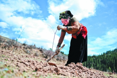 ↑青海省班玛县一名藏族群众在种植藏茶树苗。 新华社发