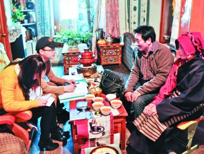 今年以来,农行康定县支行多次组织业务骨干进村入户,实地调查藏区农牧民群众生产经营情况,并现场签订农户贷款合同,将农行的惠农贷款及时送进了藏家,满足了农牧民群众的种、养殖需求。图为工作人员入户进行贷款调查。 (杨金莲 熊源 摄影报道)