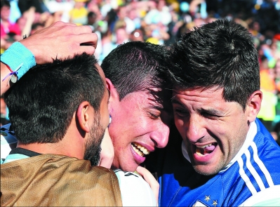 7月1日,阿根廷队以1比0战胜瑞士队,晋级八强。图为阿根廷队球员迪·玛利亚(中)进球后接受祝贺。 新华社发