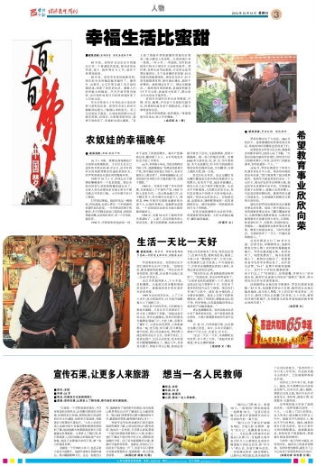 ■ 被采访者:李长生 甘孜县色西底乡恩珠一村村党支部书记、村委会主任 听说笔者来采访,村民将正在外面忙碌的李长生叫了回来。“没啥说的,都是国家的政策好。”李长生的声音很洪亮、很干脆,完全看不出他已是一位65岁的老人。 这位共和国同龄人,个头不高,皮肤黝黑,从他坚实的步履和爽朗的话语中,透着他的质朴和对美好生活的热爱。 1949年出生的李长生,上了三年小学后,因为家境贫穷,15岁就开始跟着大人下地挣工分。 “说出来不怕你笑话,小时候放牛都是光着脚,只有在冬天冻得受不了时才穿上带着补丁的鞋。”谈起这些年的生活,李长生感慨说,很多村民都是光着脚走到城门口,才穿上鞋,衣服补丁摞补丁。以前住的是草房,人和牲畜都在一起,吃不饱、穿不暖,用牛耕地,靠天吃饭,到小河边挑水吃,费时费力挑回家的水还不卫生。改革开放后,土地承包到户,生活从此改变,吃水吃饭的问题慢慢都解决了。最近几年,村里变化最大,种地不用交公粮,政府还给补贴;村民家家有了彩电,牧民也定居了;生病不发愁,看病有医保;餐桌上不再只有 “糌粑搭大茶”,大米白面、瓜果蔬菜已成为饭桌上不可或缺的了,乡里的水淘糌粑品质高口感好,央视记者还来采访过呢。 “现在的生活,真是跟城里没啥两样了。”说到这里,李长生呵呵地笑了,“以前单是秋收就需要1个月,现在是边收边打也只需要半个月,村民有了更多的时间外出打工挣钱。现在我们村48户人家中,就有28台拖拉机、1台联合收割机,基本上实现了机耕机播机收,硬化了的院坝,晒粮食也比较干净。科学种地,示范基地建设等也让地里的产出越来越高。” 更让他感慨的是,农民在政治生活中有了更多的发言权。村干部是村民选出来的,大事小事都要和村民代表开会商量。 衣、食、住、行样样都不愁,生活理念也随之改变。如今,乡风文明盛行,家家户户比卫生、比美化、比文化。 “生活一天比一天好,水淘糌粑走向世界,孙子考上大学。”谈起未来的愿望,李长生满怀憧憬。 (余应琼 文图) |