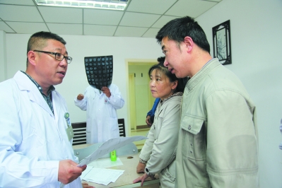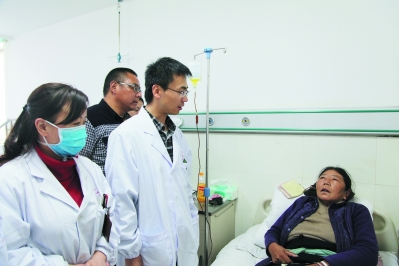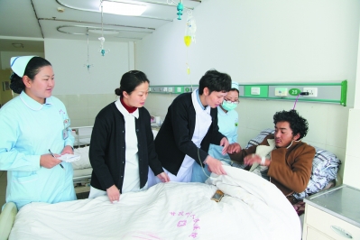 ●崔文耀(中)、李罗红(左二)开展护理查房。