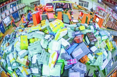 11月11日,工作人员在宁夏银川申通快递公司分拣中心分拣快件。 新华社发