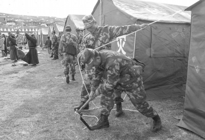 为受灾群众搭建帐篷。 ■ 本报记者 文/图 “11·22”康定地震发生后,武警8721部队坚持把抗震救灾作为最重要的政治责任、最紧迫的政治任务,按照“救人第一要务、救灾压倒一切”的要求。截止11月28日15时,累计出动兵力2000人次,参与八美镇中古村、多拉一村、金龙寺、惠远寺、等地的人员搜救、转移群众、转运物资和维护秩序等任务。 灾情发生后,该部队立即召开紧急会议,传达上级指示精神,统一思想认识,研究部署工作。师长陈锡春全程坐镇无锡基指作战勤务值班室,视频连线检查指导部队救援行动;23日,政委赵修民、政治部史伯红带工作组到藏区部队检查调研,地震发生后,第一时间深入灾区查看灾情,慰问官兵和受灾群众,现场指导救灾工作;副政委李永军带领师前指,全程随部队一同抢险救援。23日凌晨4时30分,8721部队200名兵力第一时间到达八美镇中古村,现地勘察核实灾情,及时上报灾区情况,连夜向驻训官兵传达上级指示精神,安排部署,讲清任务,明确分工,并积极与当地政府对接情况,展开对以金龙寺为重点的抢险救援行动。救援中,针对余震多、危房多、清理物资多、救援任务复杂等实际,科学编成“五组四队”,即警戒观察组、破障开路组、物资搬运组、危房拆除组、帐篷搭设组,党员突击队、医疗保障队、心理服务队、维修保障队。破障开路组连续作业,清理道路,及时打通了受灾群众的生活补给线;物资搬运组用肩膀扛出群众必需的生活物资,确保灾民基本生活所需;危房拆除组逐一排查险情,拆除危险建筑,并根据不同材料,分类存放,力争让群众损失降到最小;帐篷搭设组积极安抚灾民,连夜为无家可归的群众搭设帐蓬,安置住处;党员突击队挂戴袖标,抢在前头,干在一线,处处给部队行动带好头,树好形象;服务保障队哪里需要就奔赴哪里,完成任务及时高效。八美镇金龙寺墙体受损严重,救援官兵采取圆木抵固、埋实墙基的方法,将院墙牢牢固定住,及时把因裂缝倾斜的墙体拆除,并帮助搭建帐篷,分发部分御寒衣物。 深入群众,温暖民心。坚持把做好群众工作作为凝聚民心稳定灾区的治本之举,大力开展“十个严禁、十个做到”群众纪律教育,教育广大官兵树立“形象就是生命、服务就是团结、救灾就是维稳”的观念,严把政策界限,尊重民族禁忌,文明规范行动;通过挂横幅、打标语、发传单、播喇叭等形式,积极向受灾群众宣讲党和政府抢险救援的决心意图、方针政策,打消灾民救援难以及时到位的顾虑,坚定“有党和政府做靠山,有人民军队作后盾,一定能战胜困难重建家园”的信心,支持配合部队展开救援行动;下发《倡议书》号召全团官兵及家属向灾区群众捐款捐物,目前共募善款1万余元,捐赠衣物已从无锡驻地邮寄;及时成立5个群众工作队,深入八美镇中古村、多拉一村、金龙寺、惠远寺等受灾地点,开展“进村进户进寺庙,同救同帮同重建”和“学藏族文化、与藏族群众交朋友、为藏族同胞做好事”活动,与40户受灾藏民结对子,累计搬运物资200余吨,搭建帐篷150顶,拆除(清理)危房60间,军医巡诊55户人家,救治伤病员89人,发放防寒、消毒等药品300余件,清理打通通往村庄“生命线”道路3条,援助了大米60袋、食用油20桶、方便面30箱,最大限度地保护了人民群众的生命财产安全。 提振军心,鼓舞士气。坚决把战斗力标准牢固树立起来,紧跟任务进程和官兵思想,广泛开展《忠诚卫士誓词》、《武警战斗精神》宣誓和挑应战、表决心等活动,及时打出“人民武警爱人民”、“视人民为父母,视责任重泰山”等宣传标语,叫响“敢打硬仗、能唱主角、勇挑重担”和“五四一争第一、老虎团扬虎气”战斗口号,参战官兵面对高寒不叫难、面对缺氧不言苦,特别是即将退伍的148名老战士,在队不止、战斗不息,有的手掌磨破了、指甲挖裂了、嗓子喊哑了全然不顾,始终保持了英勇顽强、连续作战的战斗精神;积极开展“立功创模”、“火线入党入团”等活动,大力宣扬抢险救援中涌现出的好人好事和先进典型,先后有23名官兵递交了入党申请书,3人受到通报表彰;组织野战文艺小分队深入救援现场慰问演出,活跃战地文化,鼓舞旺盛士气;注重发挥新闻报道的宣传激励作用,成立报道小组,安排4名新闻骨干,跟进采集一线素材,既当报道员,又当战斗员,用DV记录官兵战斗瞬间,利用手机编发短信,抓拍图片,现场连线中央人民广播电台等媒体播发新闻。短短几天,中央电视台、《解放军报》、《人民武警报》和甘孜电视台、康巴卫视、道孚电视台等媒体对全团官兵抗震救灾事迹进行了大量深入报道,网上涌现大量为抗震官兵“点赞”的发帖、跟帖,充分反映了“虎团”官兵不畏艰险、连续作战的过硬作风。 |