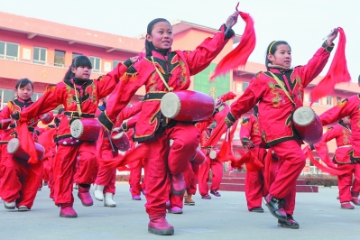 为丰富校园文化生活,河北省邯郸市肥乡县明德小学从2012年4月开始将腰鼓作为特色健身项目引入学校,每周利用体育课时间教学生们练习腰鼓,在健身的同时传承民族文化。近年来,当地教育部门开展“特色体育健身进校园”活动,太极拳、腰鼓、抖空竹等一些非物质文化遗产相继走进中小学课堂。图为12月8日,河北省邯郸市肥乡县明德小学的学生在打腰鼓。 新华社发