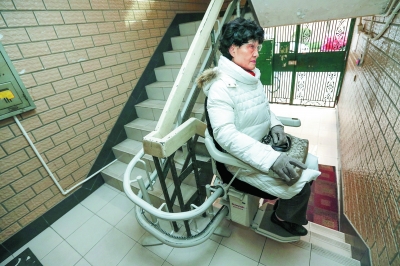 日前,一部“座椅式”电梯在上海市静安区三和花园小区内亮相。三和花园小区内的12号楼共7层,属于没有电梯的老式公寓,通过在楼梯扶手上安装约20余公分宽的轨道系统,使用者只需坐在电梯上,扣好安全带,右手直接操作把手即可。据悉,由于设置了红外线感应系统,这部电梯会在感应到异物时立即停下,拥有较高的安全系数,缓解了住户中老人和残疾人的“出行难”。图为12月17日,居民王黔在使用“座椅式”电梯。