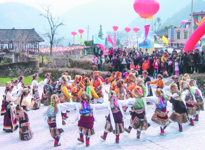 从初二开始,亲朋好友才相互拜贺,共庆新年。围跳锅庄,“锅庄”——藏族的民间舞蹈。在节日或农闲时跳,男女围成圆圈,自右而左,边歌边舞。“果桌”——锅庄舞,早期与西藏奴隶社会和盟誓活动有关,后来逐步演变成为歌舞结合,载歌载舞的圆圈歌舞形式了。《清史稿·乐志》音译为“郭庄”,近代有称“歌庄”,唯《卫藏通志》说它是围着支锅石桩而舞的意思。《西藏舞蹈概说》载:以前的康定一带,有一种商业性组织叫“锅庄”,这类商行收购土产,代办转运设有客栈,沿途过往的藏族商贾常聚集宿居其中。晚上,在院内旷地垒石支锅熬茶抓糌粑,茶余饭后不时围着火塘歌唱跳舞,以驱一天的劳累与疲乏,保持旺盛的精力,适应恶劣环境。