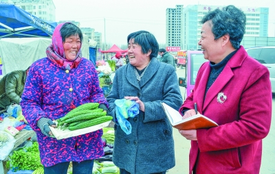 ②2015年全国两会开幕在即,十二届全国人大代表王银香(右一)在山东曹县一个蔬菜市场调研。今年两会,王银香准备了关于提倡有机共生经济模式的议案。