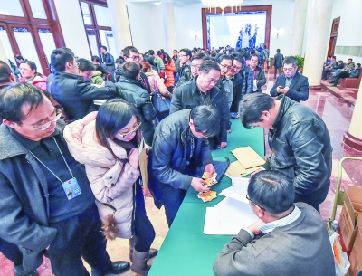 ③3月1日,参加全国政协十二届三次会议采访报道的记者在北京全国政协礼堂领取证件。 新华社发
