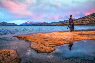 随着春意渐浓,近一段时间来康定天气晴好,周边景区景色迷人。3月22日,在康定红海子景区,一位当地牧民正在用手机拍摄夕照金山。(冯光福 摄影报道)