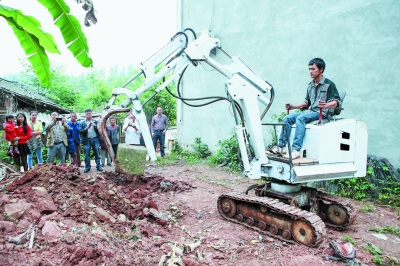 近日,四川省内江东兴区柳桥乡林坡村90后小伙代元武自制了一台挖掘机,吸引了乡亲们的目光。该挖掘机是代元武花费3个月时间设计拼装而成,花费约3万元。他为这台小型挖掘机设计了履带,同时增添了大小臂伸缩功能,以便于在狭小空间内作业,更加适合在农村使用。图为5月5日,代元武操控自制的挖掘机。 新华社发