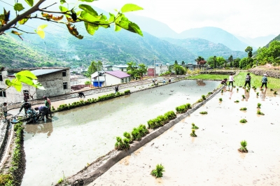 正是插秧时节,泸定德威乡农民犁田插秧,一片繁忙。