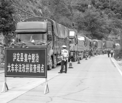 5月18日,泸定县整治违法改拼装大中型货车查缉点正式启动。 据了解,该县目前在甘谷地和得妥设立了两处查缉点,在不断加强车主、驾驶人员思想教育的同时,做到严格执法、文明执法。此外,该县还加大对查缉点工作人员的培训力度和业务指导,以提高工作效率。图为货车正在接受检查。 (尼胡克布 摄影报道)