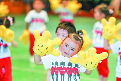5月26日,小朋友在表演团体操《左手右手》。 5月26日,江苏省南通市市级机关第一幼儿园举办主题为“艺术给我快乐·我伴艺术成长”第十二届娃娃艺术节团体操汇演,300多名小朋友和家长利用道具演绎别样团体操,在欢歌笑语中迎接“六一”国际儿童节。 新华社发