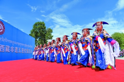 6月13日是我国第十个“文化遗产日”。西藏“非遗”进校园活动在西藏大学老校区学生活动中心广场举行,其中的“非遗”歌舞表演受到现场师生的欢迎。图为来自西藏阿里的演员在表演“宣舞”。 新华社发