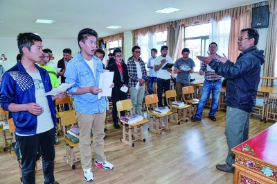 | 6月24日,首届藏戏唱腔业余培训班在位于拉萨的西藏自治区群众艺术馆开班,艺术馆聘请西藏自治区藏剧团一级演员、西藏大学客座教授,以及西藏非遗专家委员会委员等前来授课,为广大藏戏唱腔爱好者搭建一个专业的培训平台,吸引了许多爱好者报名参加。图为老师在首届藏戏唱腔业余培训班上授课。 新华社发