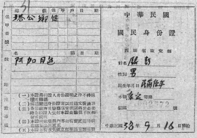 民国33年,即1944年,西康省民政厅制定《康区户口清查办法》,决定正式清查西康全省户口。民国35年,即1946年,康定县政府对康定全县人口进行统计。在1946年时候,全康定县共8622户、36797人,其中男性20889人、女性15908人(不含后重新划归康定管辖的所谓“金汤自治局”部分)。尔后开始发放“国民身份证”。发放工作断断续续,延续数年,有的人领到,也有的人根本就没看到过这种“国民身份证”。 这张看似简陋的纸张,就是到了1949年才发给这位居住在塔公乡、名叫“银彭”这个人的国民身份证,而对于今天的我们则是难得一见的珍贵档案材料。 |