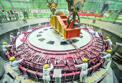 10月25日10时38分,总重量达700吨的黄金坪水电站1号20万千瓦机组转子一次吊装成功。当日上午9时30分,鞭炮齐鸣,业主组织设计、监理、施工单位、厂家代表等在现场举行了隆重而简朴的吊装仪式,共同见证并指导此节点目标的顺利完成。图为安装、调试现场。 (兰天 摄影报道)