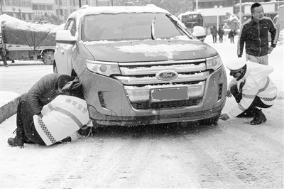 康定交警大队城区中队的扎西泽仁立即走上前去询问:“前面更滑,你肯定上不去,有没有链条?”车主谭光复随即下车答道:“有,可是不会上。”