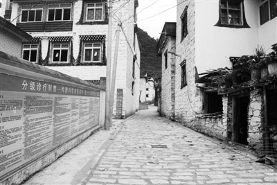 在乡干部的带领下,记者沿着正在铺设的崭新石板路,前往村民周富红家。在那场百年难遇的特大灾难中,周富红和家人失去了房子和财产,一夜之间一贫如洗,无立足之地。一路上,记者还能看见当年泥石流灾害在房屋墙壁上留下的痕迹。一些已经重新修缮的房屋墙根处,泥石流的黄色印痕十分明显,与墙壁刷白的地方形成鲜明的对比。