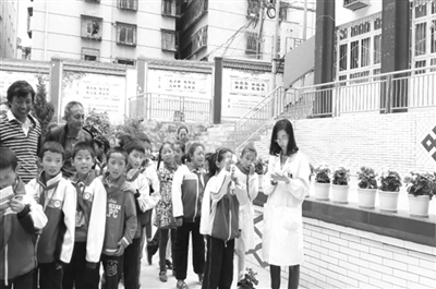 活动现场,医护人员为康定市民族小学200余名学生进行了视力普查,对发现有视力问题的学生建立个人视力档案,详细记录了检查结果,学生们可凭借报告单随时到医院接受免费验光。图为活动现场。
