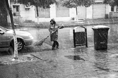 过去,东北的环卫工人最怕冬天下雪。王福成干了17年环卫工作,刚开始做环卫工作的头几年,长春下过几场大雪,积雪深处要没过小腿。那时候,王福成和工友们夜里12点就出门扫雪,整宿地用锹铲、用镐刨,再用小推车把雪运到集中堆放处。零下20多摄氏度的东北深夜,不仅觉不出冷,反而浑身大汗。被汗水浸透的棉袄直接冻在身上,脱下来能直接立在地上不倒。