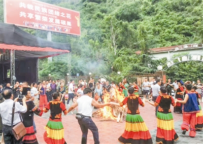 7月22日,泸定县城区彝族同胞欢聚一堂,共同庆祝传统火把节。图为彝族同胞跳起欢乐的彝族达体舞。 (县委中心报道组 尼胡克布 摄)