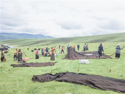 近日,炉霍县组成罗宗片区夏季牧场稳控工作组到牧场开展工作。 自驻扎以来,工作组共走访牧民300余户,巡防边界上百公里,化解边界矛盾纠纷十余起,帮助牧民搬场2次,帮助牧民解决了诸多生产生活中的困难。并将各类惠民政策送到牧民家,进村入户帮助牧民排忧解难,维护牧民生命财产安全,成为边界牧民的贴心人。图为工作组帮助牧民搭建帐篷。 (龚建强 摄影报道)