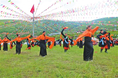 7月20日,炉霍虾拉沱首届“农民丰收节”开幕。此次“农民丰收节”以继承和发扬虾拉沱传统农耕文明和优秀传统为主题,旨在大力弘扬虾拉沱“勤劳、友善、和谐”的传统美德,庆祝丰收、传承文化、团结邻里、文明村风。图为群众歌舞欢腾庆丰收表演现场。