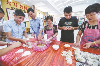 7月30日,在长兴县小浦镇合溪村文化礼堂,村民们和退伍军人一起包馄饨。 当日,浙江省长兴县小浦镇合溪村在村文化礼堂开展退伍军人联欢活动。来自长兴县中医院的医生们为该村退伍军人进行免费体检,合溪村的村民还与退伍军人一起包馄饨、品尝劳动成果,迎接“八一”建军节。 新华社发