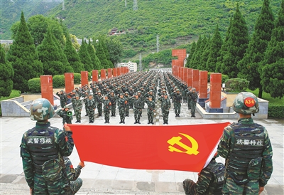 “我决心做党和人民的忠诚卫士,我宣誓:永远忠于党、忠于社会主义、忠于祖国、忠于人民……”风吹雪落,神圣的忠诚卫士誓词响彻整个山顶,在康巴第一关,海拔4670米的折多山山顶,参加“魔鬼周”极限训练的特战队员们向党旗发出了郑重的承诺,这是该支队将政治工作开展到“魔鬼周”极限训练现场的一个缩影。