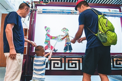 8月15日,在内蒙古展览馆内,游客在体验皮影戏表演。 近日,“守望相助——56民族非物质文化遗产邀请展”在位于呼和浩特的内蒙古展览馆举行。各民族的非遗传承人在展览现场进行展示展演,吸引市民前来观看体验。 新华社发