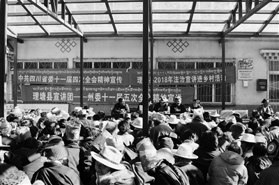 近日,理塘县组织宣讲员赴海拔4600多米的高寒牧区乡曲登乡,开展了省委十一届四次全会精神宣讲,该乡10个行政村700余名牧民群众聆听宣讲,让党的声音及时传达到偏远牧区。图为宣讲现场。 县委中心报道组 叶强平 周鹏 摄影报道