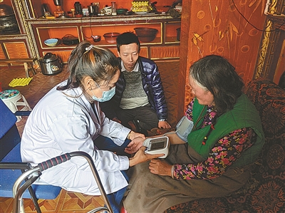 甘孜日报讯 每年5月至7月初,是理塘县的虫草采挖期,大部分青壮年上山采挖虫草挣钱,各乡镇基本只留下老人,特别是年纪大的母亲看守家园。为关爱留守母亲,在母亲节来临之际,理塘县各乡镇卫生院开展“关爱留守母亲”行动。图为5月10日,喇嘛垭乡卫生院医生进村入户为留守母亲量血压。