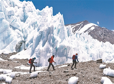 13名登山者5月30日成功登顶世界最高峰珠穆朗玛峰。这13人是2019年珠穆朗玛峰北坡即位于中国西藏自治区一侧的登山季最后一批登顶的登山者,随着他们于5月31日安全下撤,2019年珠峰北坡登山季就此宣告结束。期间,珠峰一如既往吸引了业内人士和普通大众关注的目光,已成为一年一见的标准“网红”。 图为三名登山者在珠峰海拔6000米左右的绒布冰川冰塔林间徒步。