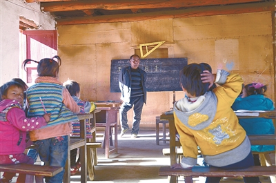 低年级教学完毕后,给孩子们布置相应的作业,让他们完成课堂作业,他又回到教室后的第二个黑板前,给高年级的孩子们进行教学。就这样,在一天的时间里,他没有休息时间,上课、批改作业、撰写教案占去了他一天时间的大部分。中午时分,他要为全校40余位孩子熬制清茶,吃中午饭时,他与孩子们在操场里席地而坐,嚼着干硬的馒头,喝着滚烫的清茶,与孩子们交心谈心,其乐融融。