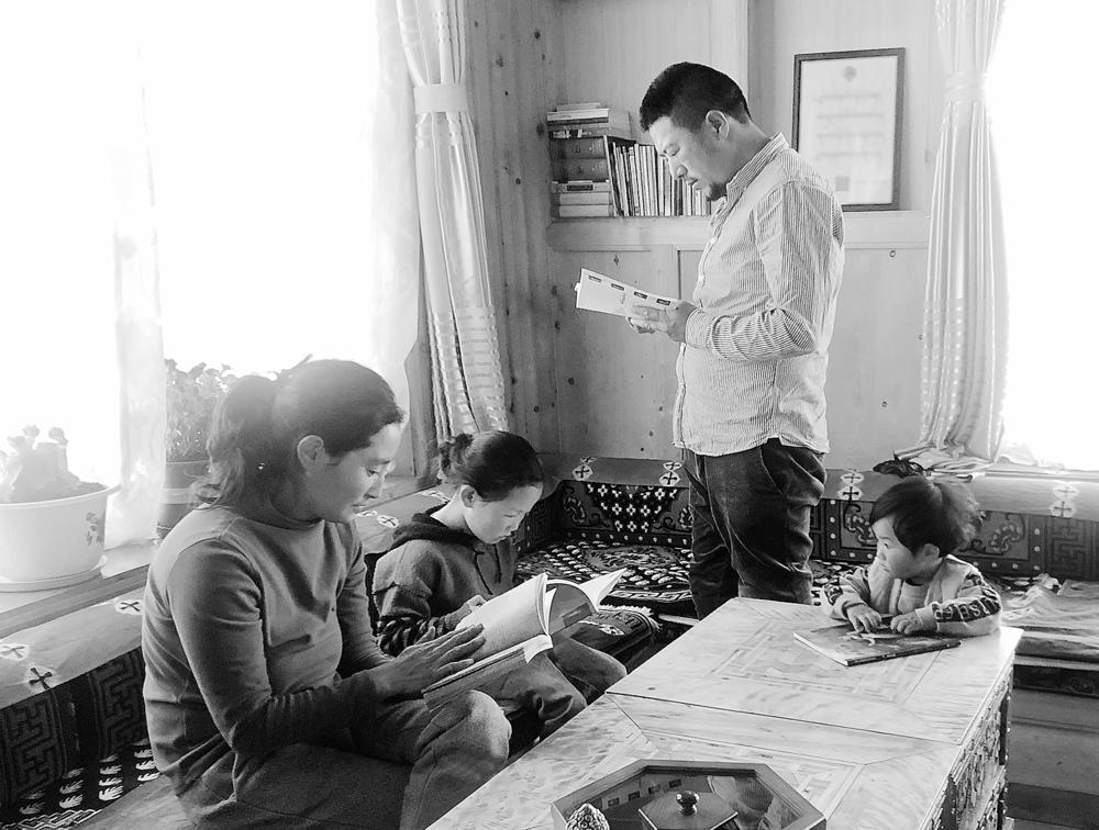 据昂旺曲批介绍,父女俩常常坐在藏桌旁,阿爸给孩子讲《格萨尔王传奇》和《阿古顿巴的故事》,阿妈斯郎珍呷端上一壶香喷喷酥油茶,大家一边喝茶一边听故事,这是一家人最温馨的时刻,一家人谱写着藏书、护书、读书、用书的良好家风。