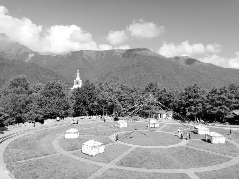 走过游客驻足、虔诚礼佛的朝拜大道,便来到了通体朱红,雕刻精致禅的吉祥禅院。我想,里面的佛像肃穆,拜者虔诚, 游者安静,我不忍打扰这一切。绕过禅院,继续行走,只见浩瀚的森林环拥着禅院,山风拂过树梢,过滤的阳光星星点点地洒落在五彩的经幡上,簌簌作响,每一声都是念出的一遍经文。鸟雀悠然飞过身边,在路边的树上追逐,在地上一跳一跳的觅食,心中就有莫名的感动升腾而起。