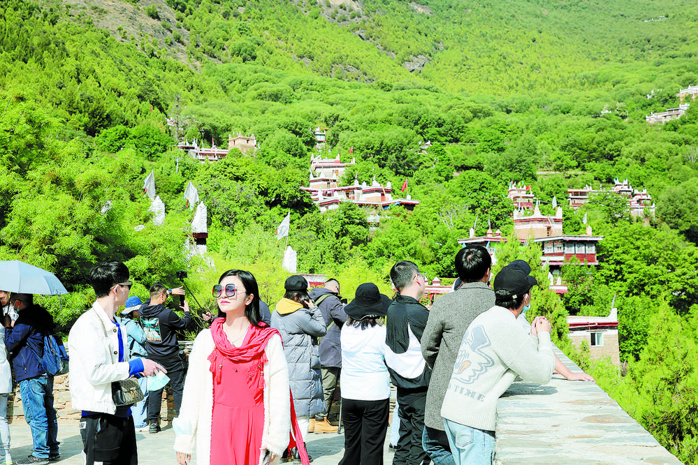 游客在甲居藏寨观景台欣赏美景。