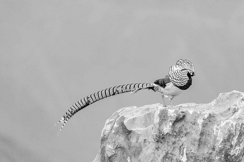 白腹锦鸡,虽然名字里有“鸡”,其实是雉科锦鸡属的一种鸟类,也有叫铜鸡、笋鸡、衾鸡、箐鸡和银鸡的。国家二级保护动物。雄鸡全长约140厘米,雌鸡约60厘米。雄鸡头顶、背、胸为金属翠绿色;羽冠紫红色;后颈披肩羽白色,具黑色羽缘;下背棕色,腰转朱红色;飞羽暗褐色;尾羽长,有黑白相间的云状斑纹;腹部白色,嘴和脚蓝灰色。雌鸡上体及尾大部棕褐色,缀满黑斑;胸部棕色具黑斑。栖息于海拔1500-4000米的常绿阔叶林、针阔叶混交林和针叶林带,也栖息于林缘灌丛、林缘草坡、疏林荒山和矮竹丛间。以农作物、草籽、竹笋等为食,兼食昆虫。3月初雄鸡即出现发情行为,雄鸡间出现追赶和争斗,并开始占领领地,开始求偶。