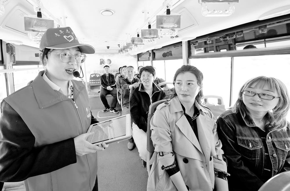 近日,河北省唐山市海港经济开发区通过“红色电波”宣传大篷车、红色主题公交车、红色电影进农村等多种形式打造党史学习移动课堂,将党史知识潜移默化地传播到群众心中。 图为唐山市海港经济开发区志愿者宣讲员在红色主题公交车上给乘客讲革命故事。 新华社 发