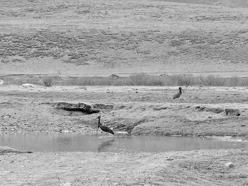日前,色达县大章乡派出所负责人在打西贡玛村帝龙沟下村途中,偶遇两只正闲庭信步、悠然自得“散步”的国家一级重点保护野生动物——黑鹳。
