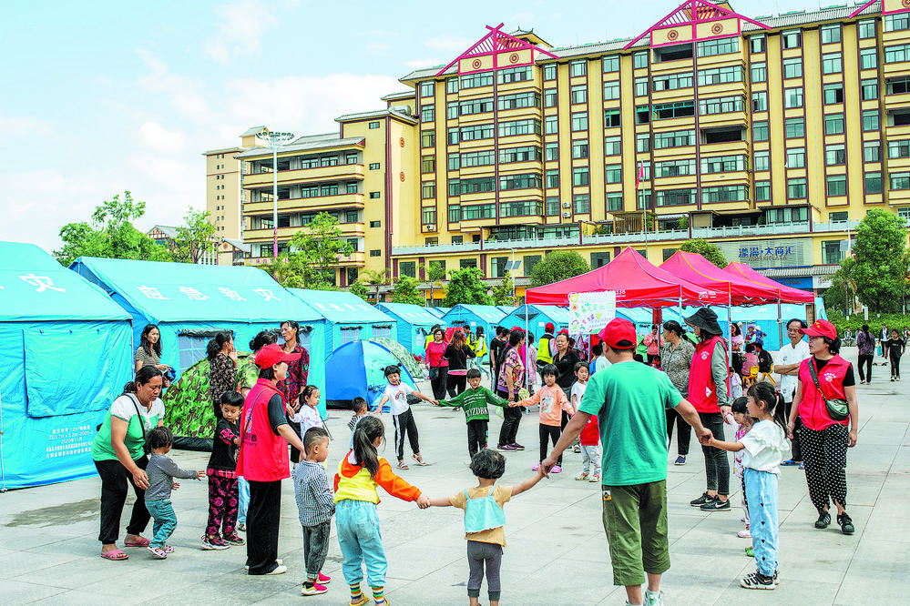 5月21日21时48分,云南省大理白族自治州漾濞县发生6.4级地震。目前,县城最大的受灾群众转移安置点人和广场安置点,已实现有临时住所、有饭吃、有衣穿、有水喝、有医疗服务、有安全感、有卫生防疫举措的“七有”,受灾群众得到妥善安置。 图为5月23日,在云南省漾濞县人和广场安置点,孩子们在做游戏。 新华社 发