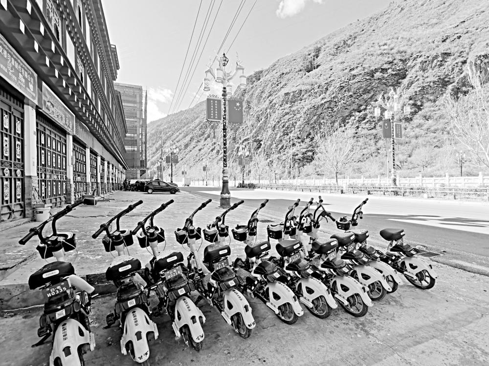 排列有序的共享单车。