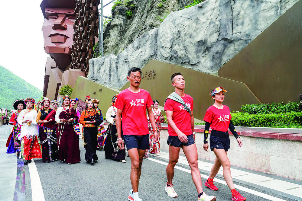 “嘭!”一声发令枪响,创造中国“铁人三项”历史的运动员李鹏程、女子越野跑精英运动员郑钧月、甘孜籍越野跑精英运动员多吉从泸定县樱桃谷出发向泸定桥进发,以此致敬红军飞夺泸定桥昼夜行军240里的壮举。