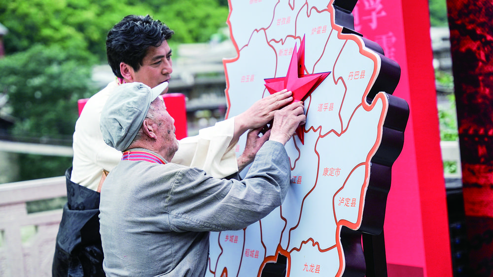 途中设置的15个接力站点,象征着红军长征途中先后转战甘孜州的15个县(市)。护跑团从各处点位加入,最终将行军背囊中的五角星送到96岁老兵陈忠的手中,启动“红色记忆”魔方。