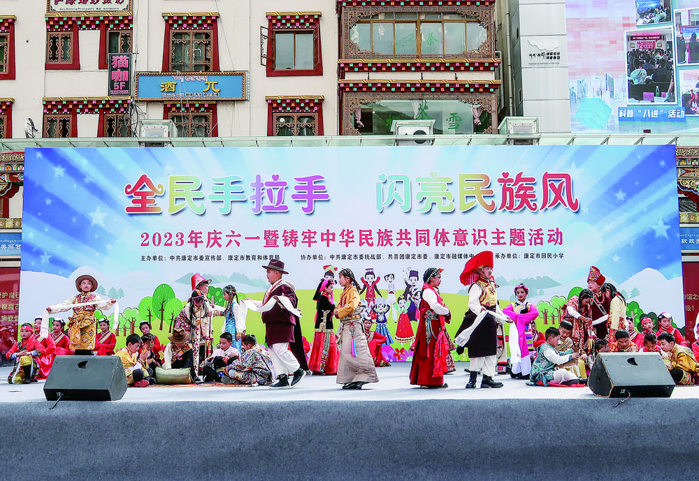 “五十六个星座五十六枝花,五十六族兄弟姐妹是一家,五十六种语言汇成一句话……”6月1日上午,康定市回民小学近800名师生穿着各民族服装,来到情歌广场,以丰富多彩的歌舞表演共庆“六一”儿童节。