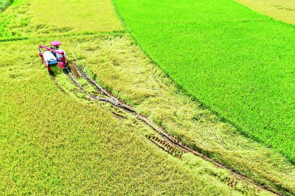 初秋时节,各地农民抢抓农时开展农事活动,田间地头一派繁忙景象。 8月25日,在湖南省永州市道县梅花镇棠下村,农民在收割稻谷(无人机照片)。 新华社 发