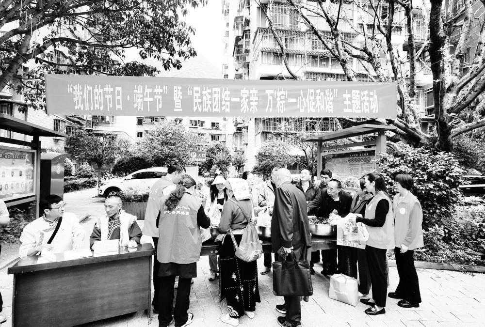 在泸定县龙吟半岛小区,衣着不同民族服饰的居民和小区志愿者们一大早就齐聚在小区内的甘孜县驻泸定老年活动中心“石榴籽工作室”,兴致勃勃地准备一起包粽子。