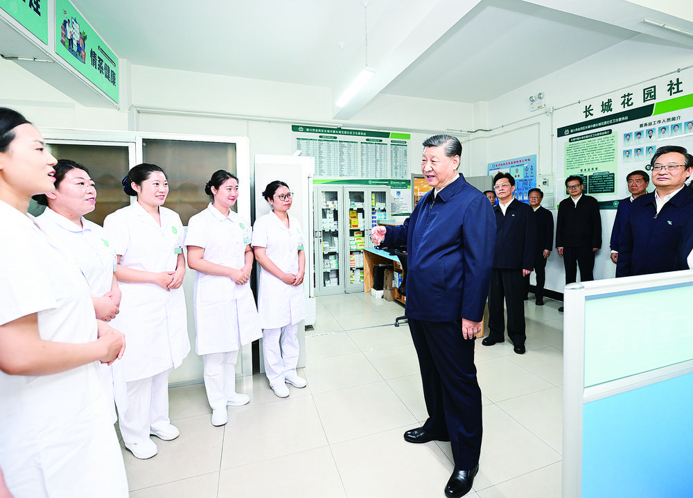 六月十九日至二十日,中共中央总书记、国家主席、中央军委主席习近平在宁夏考察。这是十九日下午,习近平在银川市金凤区长城花园社区党群服务中心社区卫生站同医务人员亲切交流。 新华社记者 谢环驰 摄